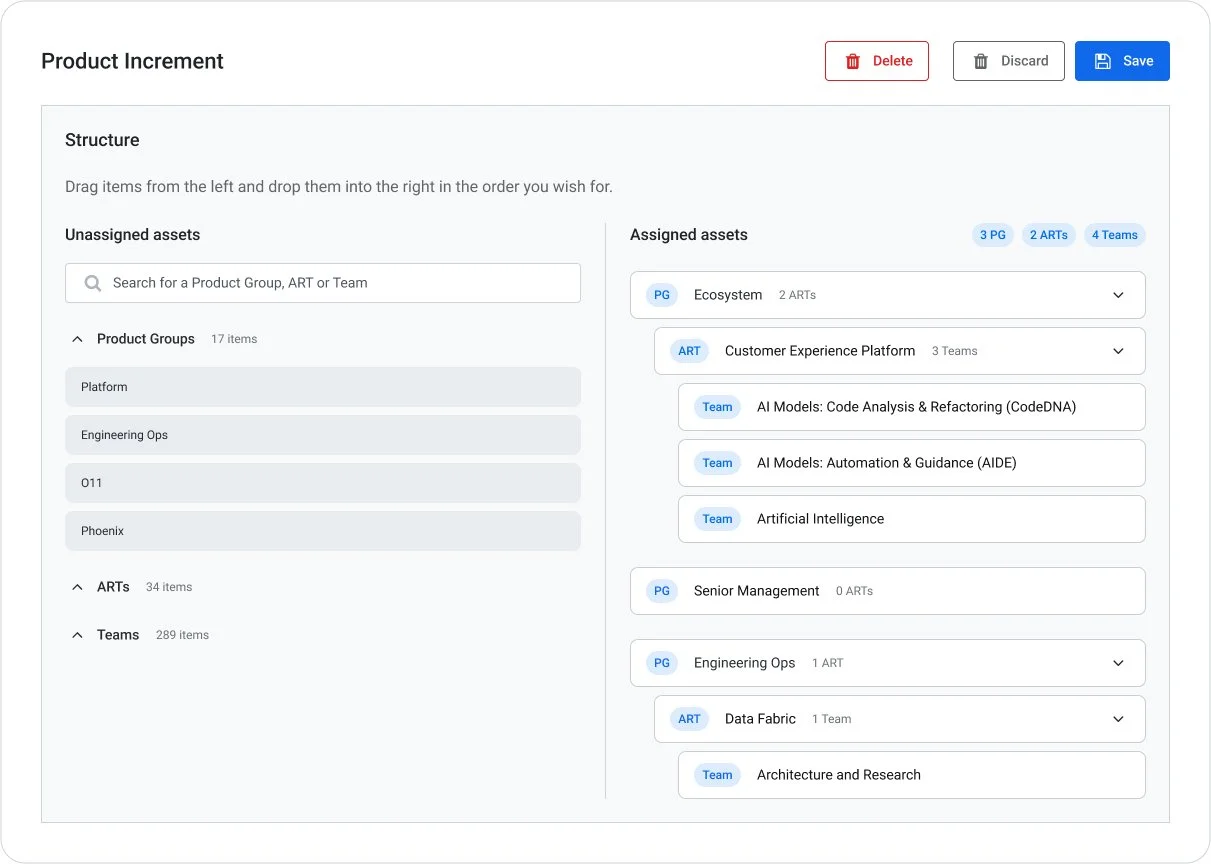 I focused on a drag-and-drop system so the user has visibility of the entities on both sides - assigned and unassigned assets - at all times for better management control, as well as search inputs on both sides to make selection faster.