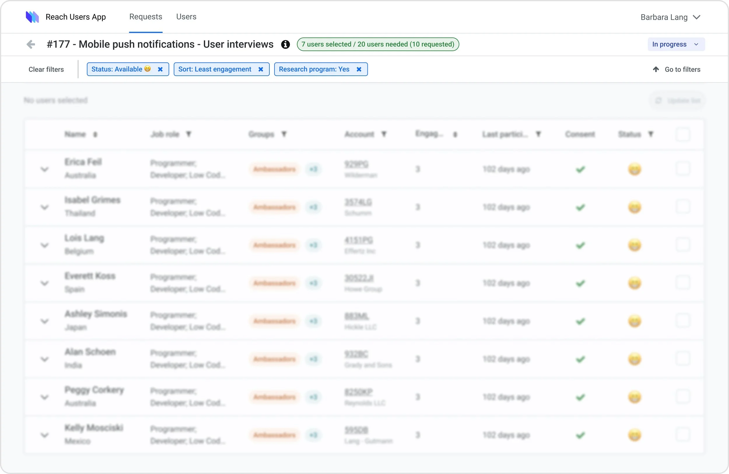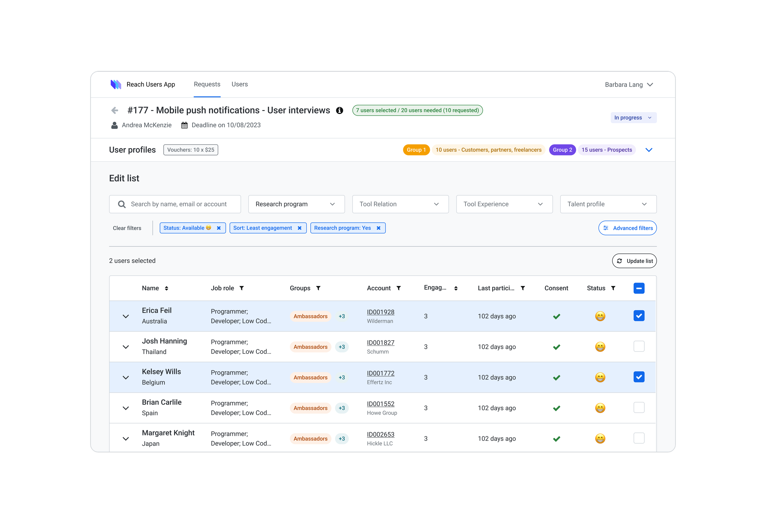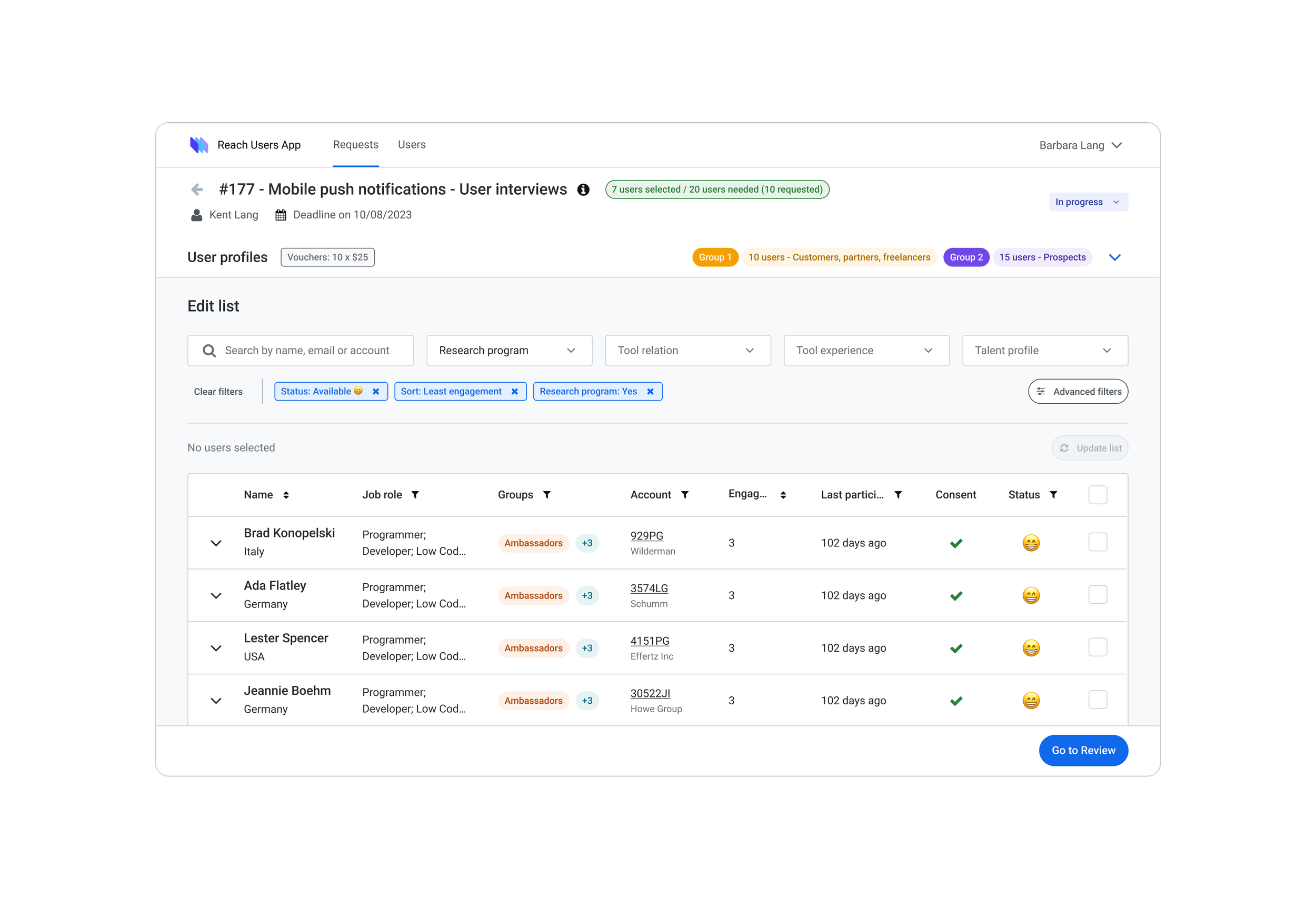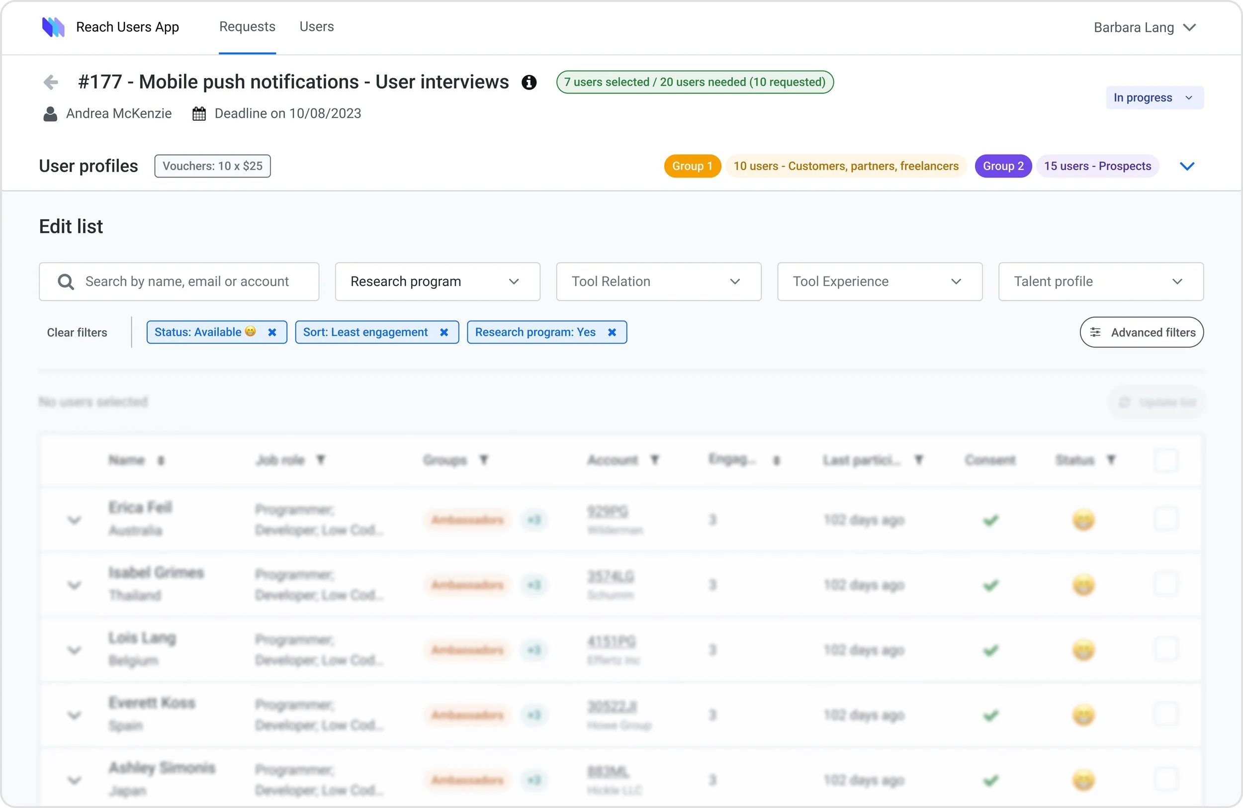Pete, the UX Researcher, provides a list of users based on the internal databases and availabilities.
